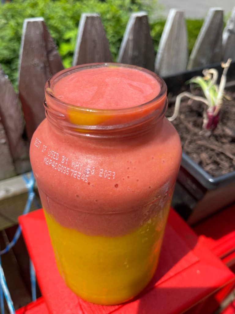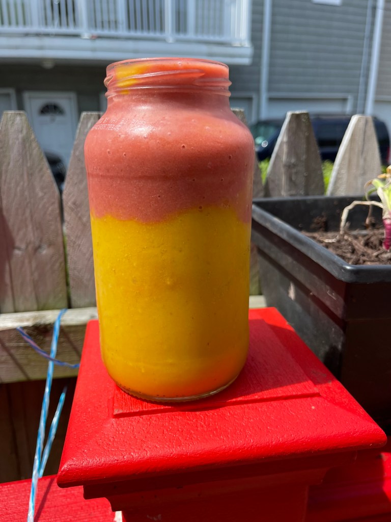 So today’s post was inspired by my three years old sons. I gave him two options for his choice of smoothies for the day: a strawberry banana smoothie (red) or a pineapple-mango smoothie (yellow), and instead of choosing one, he wanted both, so I obliged.