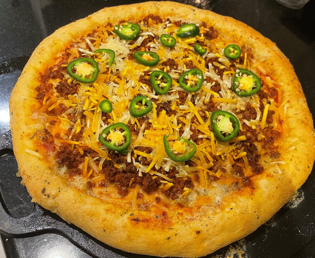 Because I have two toddlers at home, we made two pizzas to avoid adding jalapeno to theirs. We also used less Chorizo and more cheese as a topping because it has a slightly spicy taste.