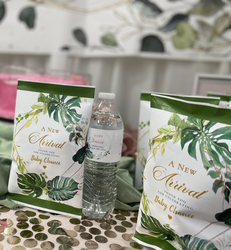 Party FavorsΒ – I had previously ordered party favors on Amazon, which did not arrive in time. Little did I know that they had this all sorted out; if I am honest, it was for the best because this went well with the theme. So for the party favors, they printed labels for the water bottles and bags of chips that said, “A New Arrival.” I loved it.