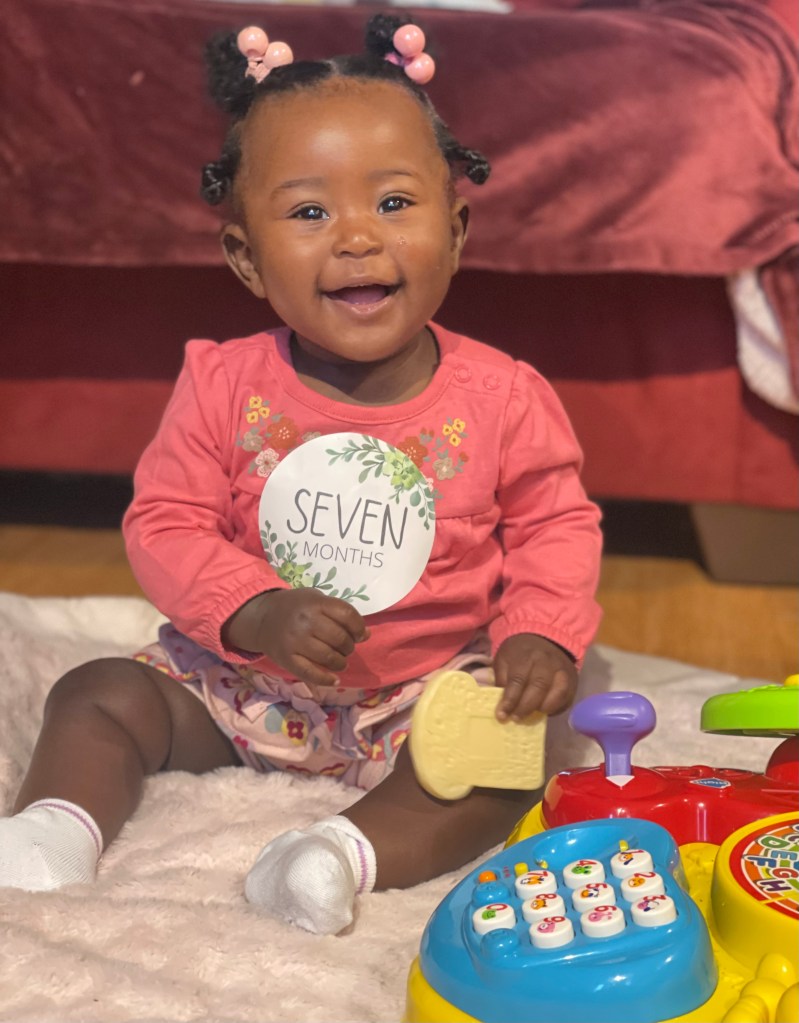 My Emmah-Rose is a happy, smiley baby. She is quite a personality and is significantly determined whenever she wants something. She is that baby that touches and puts anything in her mouth, which drives me crazy and always keeps me on my pees and cues. “The wheels on the bus” is her favorite song; whenever she gets cranky, especially in the car, playing that song relaxes her. She is so excited when she sees her older sister and brother. They are her absolute favorite people. She loves caressing her brother’s ears whenever he is close, and whenever he ignores her, she pulls his hair.