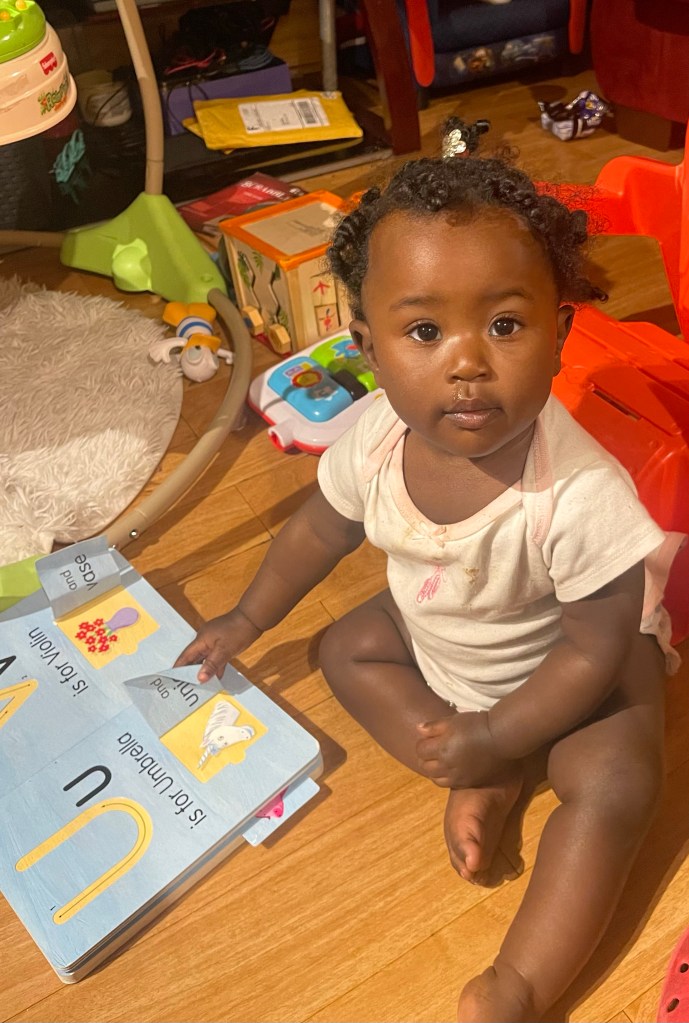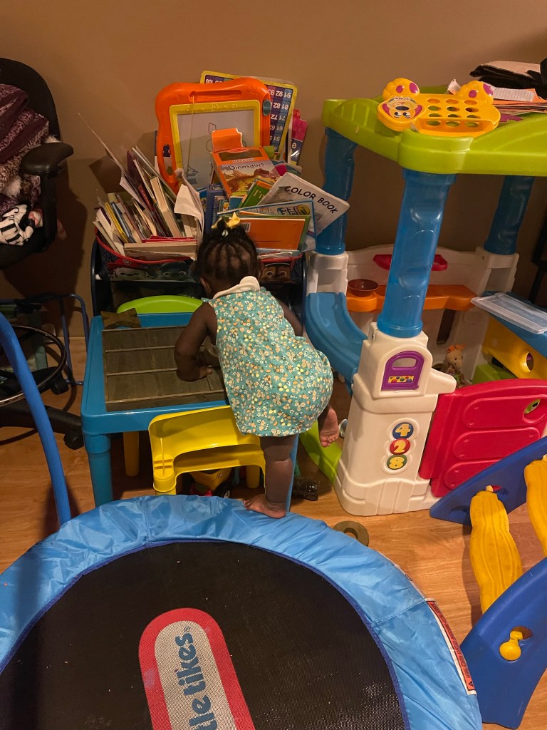 My baby empties baskets, hampers, drawers, cabinets, and the dishwasher; just about everything is thrown to the floor once she gets her hands on them. I have never had to tighten up on security with the my first two, but this one is quick, touchy, and medelling. She loves turning the pages of books and ripping them as well. And oh, the “Wheels on the Bus song” by Ms. Rachel is still her favorite.