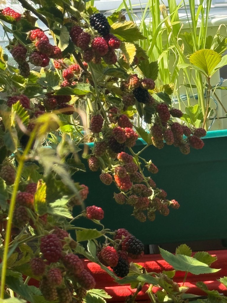 The strawberries did great, giving us a bountiful spring harvest. The blackberries were exceptional—we harvested so many, and the tree is still loaded. Unfortunately, just a few days ago, I noticed the tree suddenly turned brown, and so did the blackberries.
